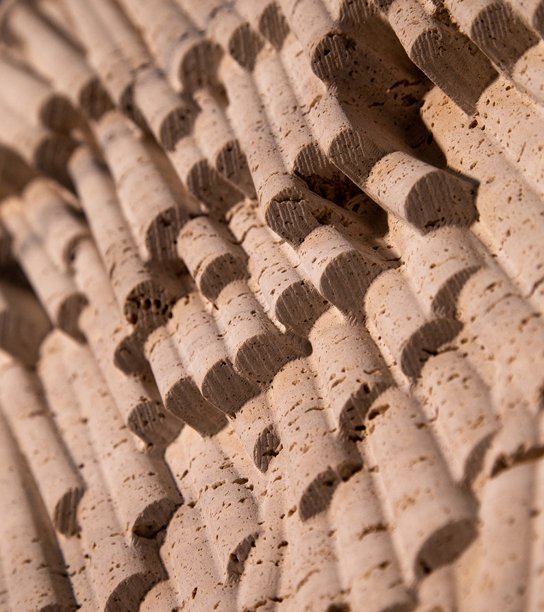 The inspiration emerged from fabric—a material Minkoff often uses to shape her lifestyle products. The challenge was to translate that softness into stone, capturing its sense of movement while preserving the integrity of the material. The final piece speaks of transformation. What appears soft is carved. What seems weightless is grounded.