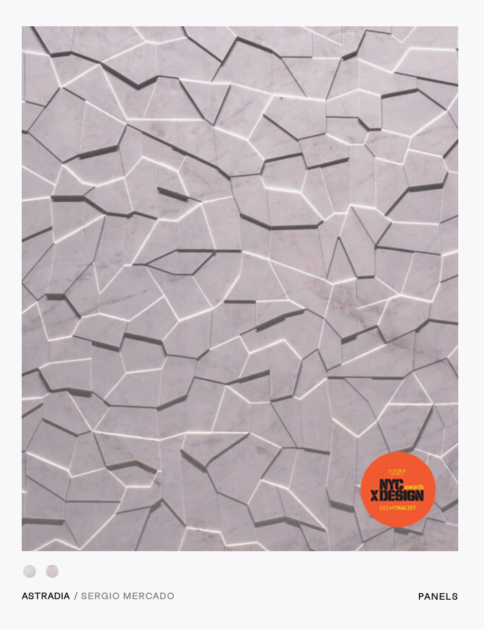 Sergio Mercado envisioned a panel that captured the tactile elegance of carved stone—something he often sought but rarely found. Through a serendipitous collaboration with ABC and Borrowed Earth, Astradia took shape—not as a pre-determined plan, but as a fluid, organic evolution of form and surface.