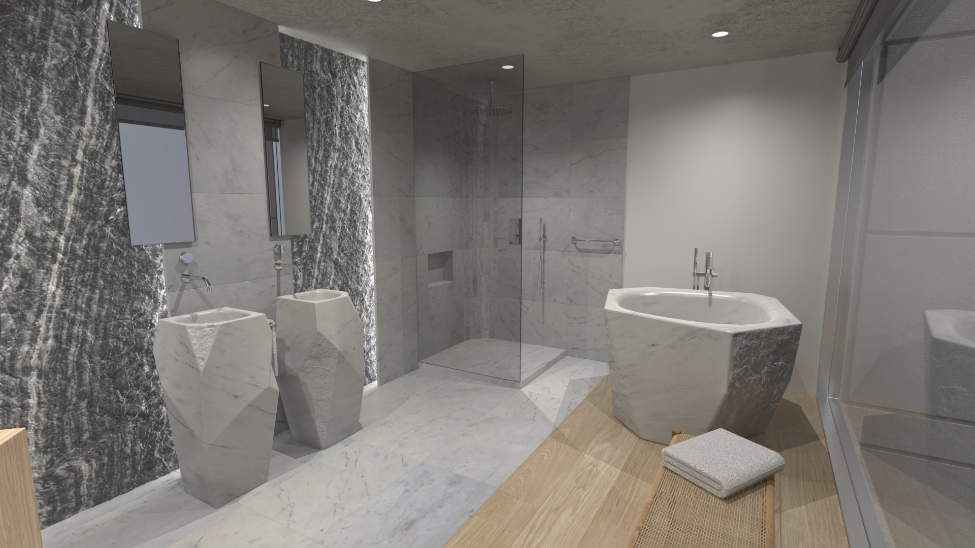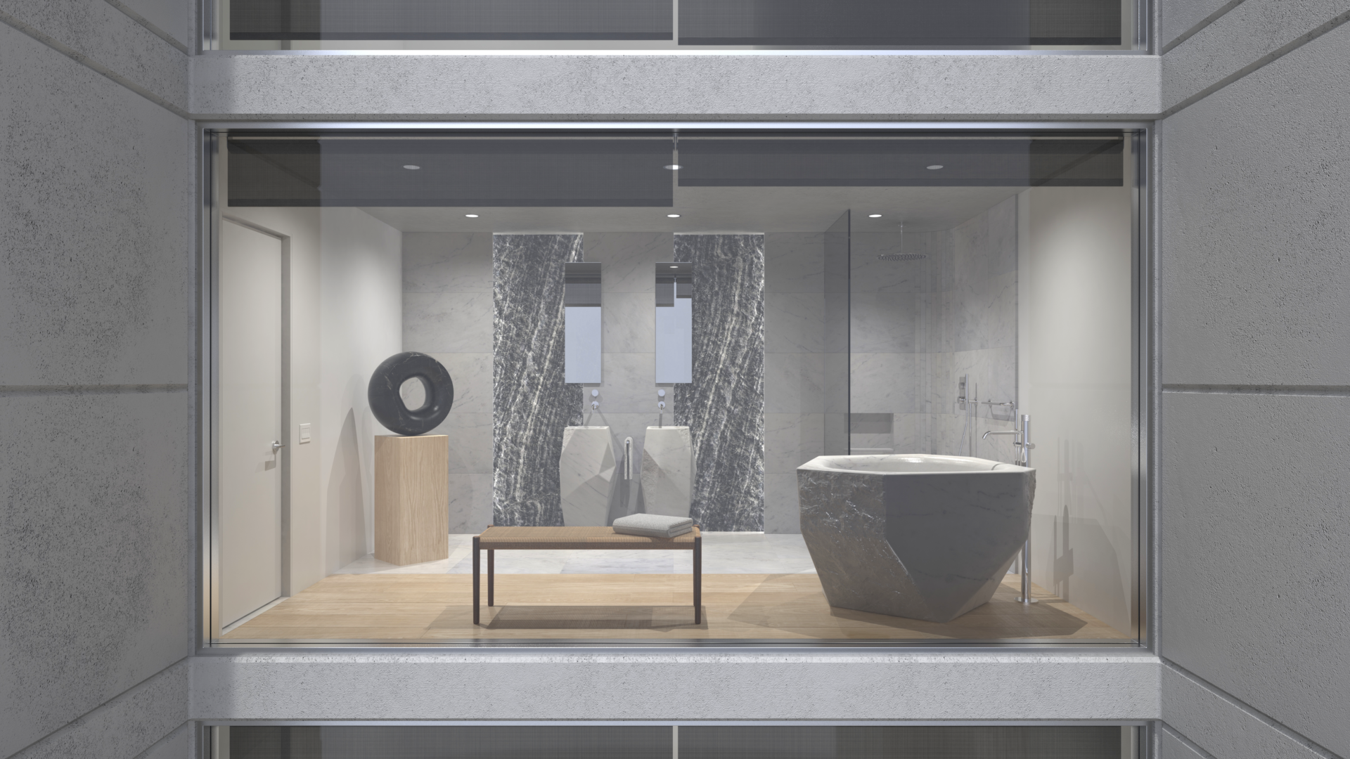 From the outset, this was not about applying stone to architecture. It was about allowing carved stone to define it. Each concept began with the fixture itself — its form, weight, edge condition, and texture — and the surrounding architecture responded accordingly.