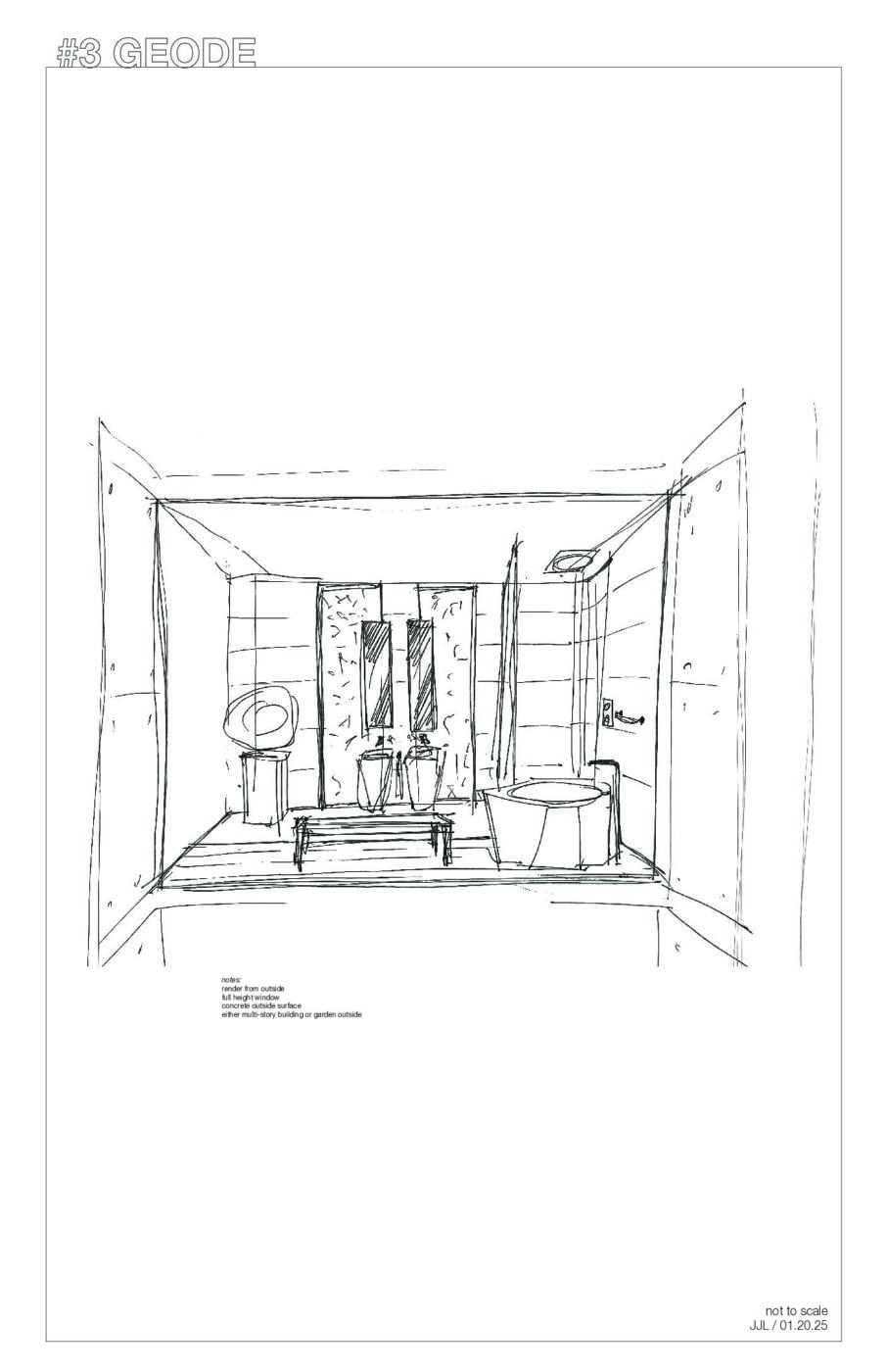 Early concept sketch for the Geode bathroom environment, establishing proportion, fixture placement, and material rhythm.