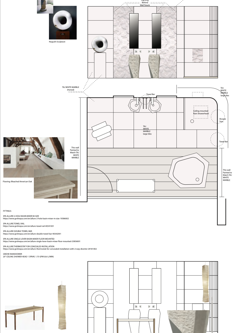 Geode concept board illustrating plan, elevations, Taj White Marble applications, and fixture pairings.