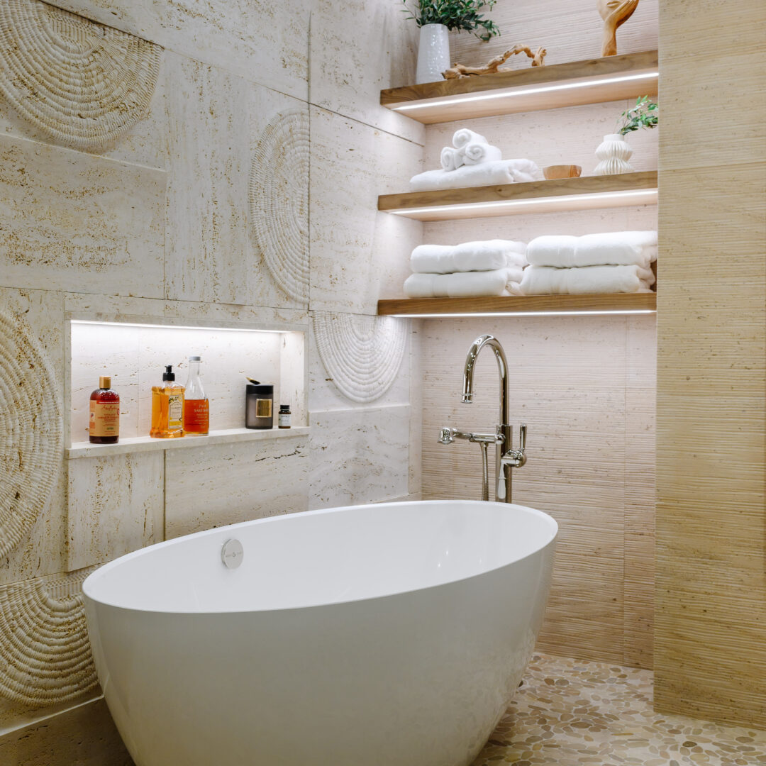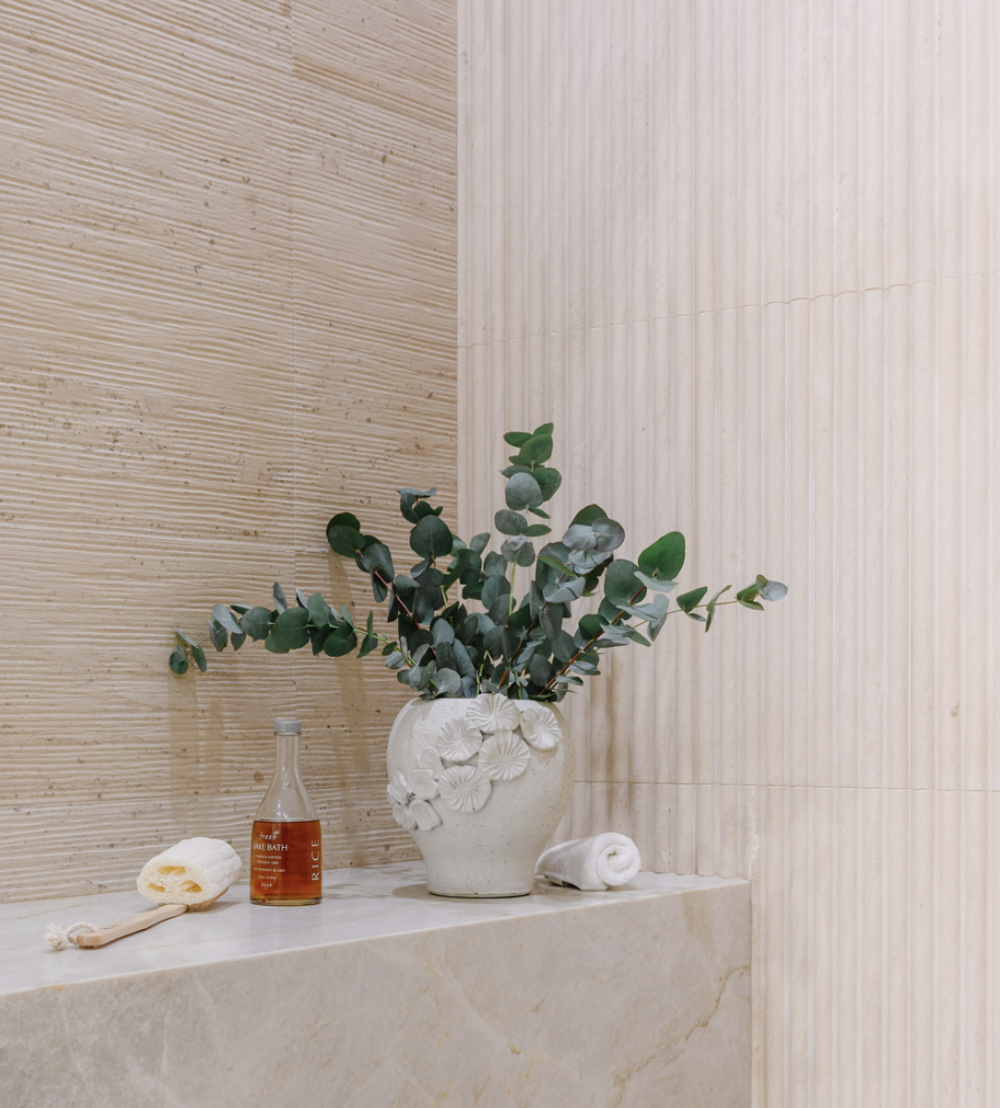 Weave Tile in Travertine Beige — forms the sculptural feature wall, bringing a rhythmic, tactile quality that softly reflects light.
