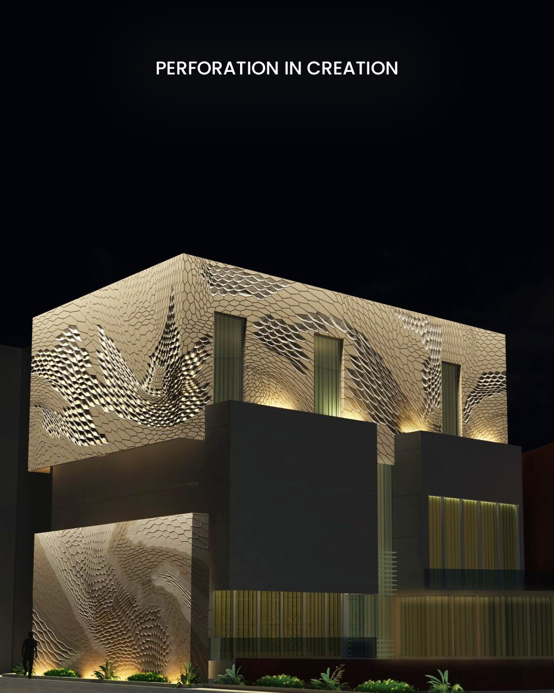 The concept began as a study of the hexagon and how its structure could evolve into something more fluid and expressive. By stretching and reshaping this form, we created a connected network of polygons that bring movement and rhythm to a solid surface. The result is a geometric pattern that interacts beautifully with light and shadow, adding depth and texture to the facade.
